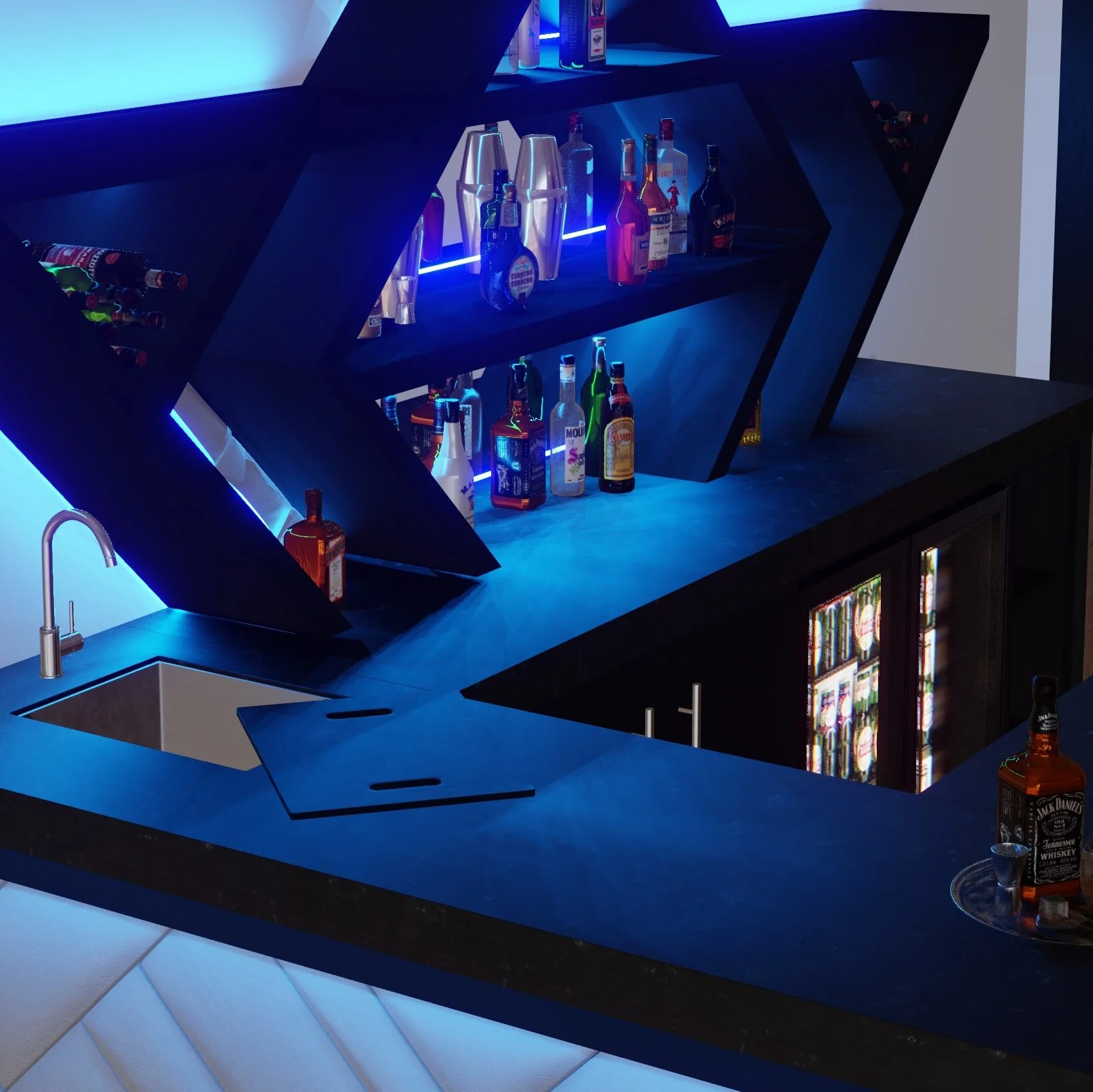 This one of a kind bar combines functionality and luxury in the form of diamond-shaped angular back shelving